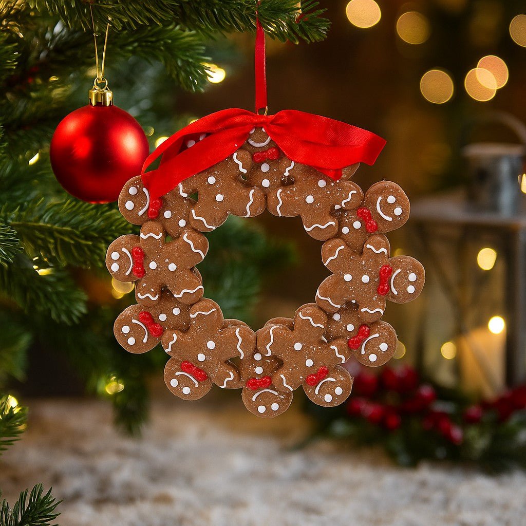 Bring festive cheer to your home with this delightful Gingerbread Man Wreath! Handcrafted from clay dough, this charming decoration features adorable gingerbread figures arranged in a cheerful wreath design. Perfect for adding a touch of seasonal warmth to any room, this small hanging piece captures the cosy spirit of the holidays. Whether displayed on a door, tree or window, it's sure to bring smiles and spread Christmas joy throughout your space.