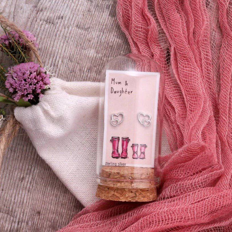 Terrarium Bottle 'Mum Daughter' Two Hearts Silver Earrings