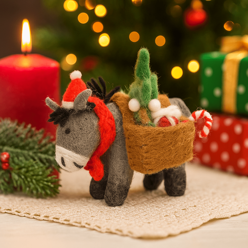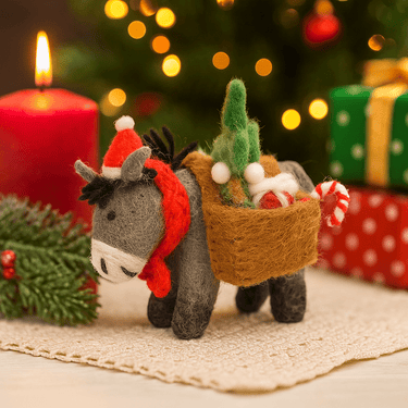 This donkey is packed with lots of Christmas goodies in his panniers ready to spread the Christmas cheer. Handmade from 100% wool felt in Nepal, plastic free and Fair Trade too.
