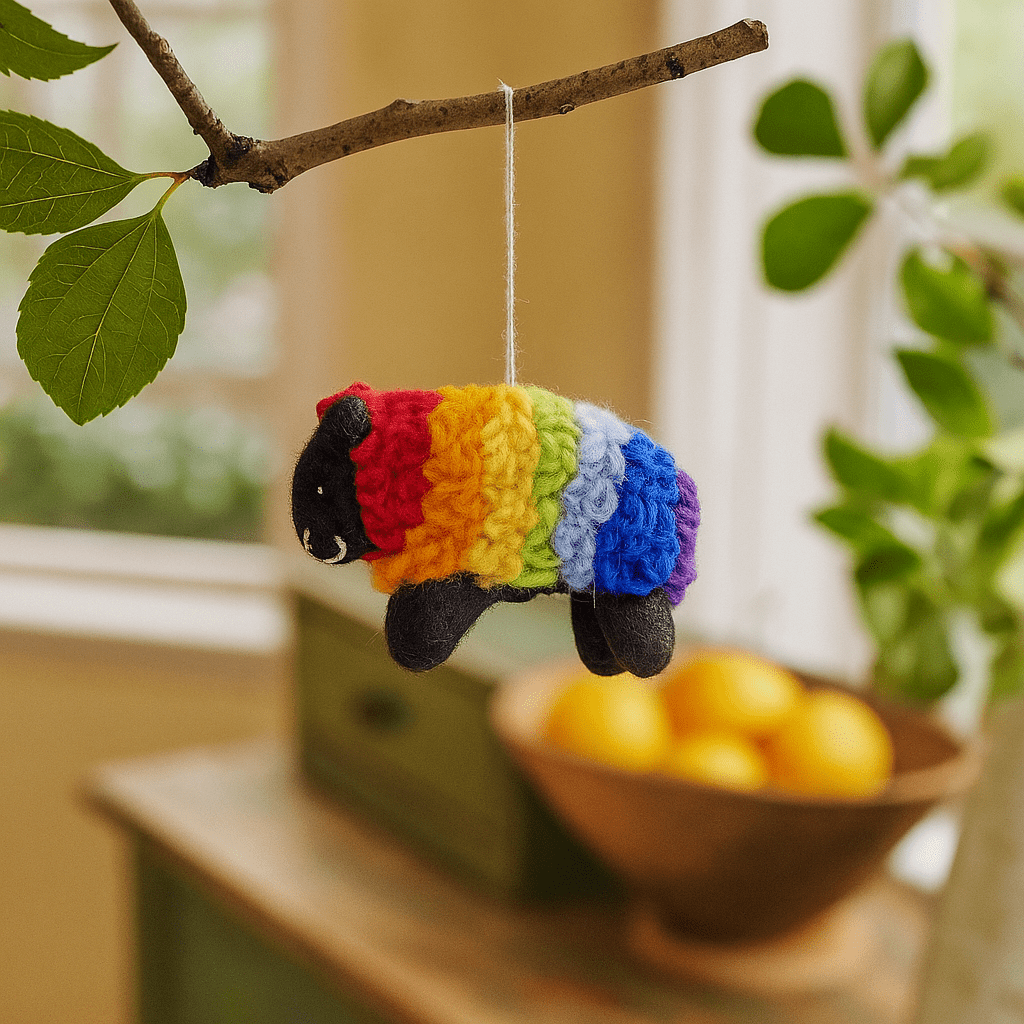 Bring a burst of colour and charm to any space with this Mini Rainbow Sheep Felt Decoration. Soft and fluffy, this little sheep adds a playful touch to your home or workspace. Its vibrant rainbow hues brighten up shelves, desks, or nursery corners, making every day a bit more cheerful. Perfect for lovers of whimsical décor or as a delightful gift to spread smiles!