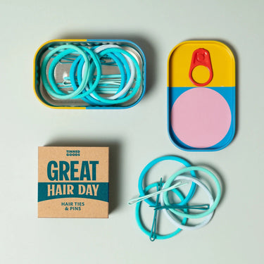 The beautiful tin contains 10 hair ties and 6 bobby pins for taming manes on the go. Think cars, gyms and school bags.