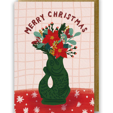 Get ready to giggle this Christmas! This cheeky greetings card showcases a vibrant green gluggle jug brimming with a stunning poinsettia bouquet, the perfect blend of festive flora and kitchen humour. Make someone's Christmas morning extra special with this delightfully daft design that's guaranteed to brighten their day!