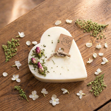 Romantic small heart-shaped candle adorned with natural petals and shredded greens in a delicate design. This charming handcrafted soy candle combines intimate heart shape with beautiful botanical decoration, perfect for creating romantic ambiance. Wax: 100% natural soy wax